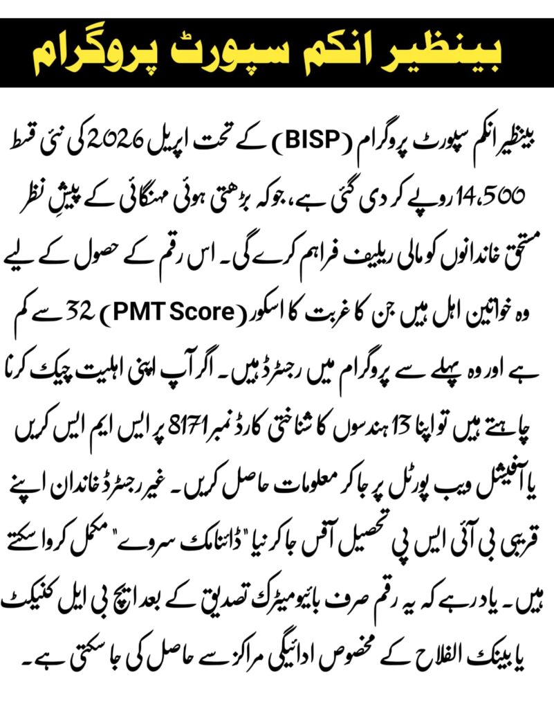 The Benazir Income Support Programme (BISP) remains the backbone of social safety in Pakistan. As inflation impacts daily lives, the government has announced a significant boost for the year 2026. For the month of April, eligible families are set to receive a revised payment of Rs. 14,500.