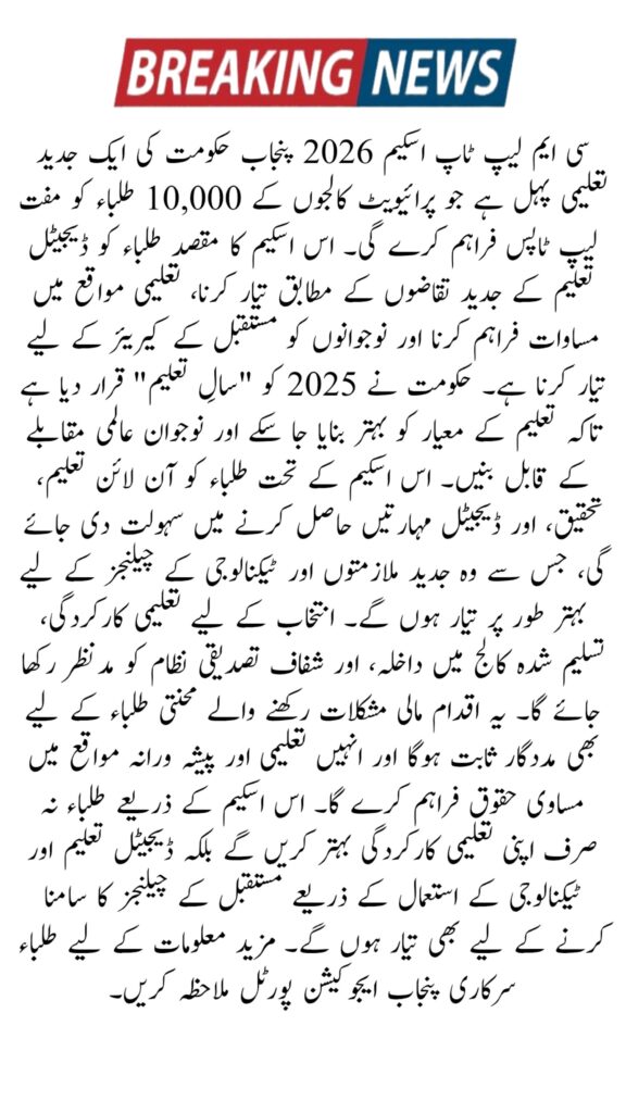 The CM Laptop Scheme 2026 is a landmark initiative by the Punjab government to promote digital education and modern learning for students. For the first time, private college students are included in this program, making it possible for 10,000 deserving students to receive free laptops. The main aim of the scheme is to reduce the technology gap between government and private institutions, support online learning, and prepare youth for modern career opportunities.