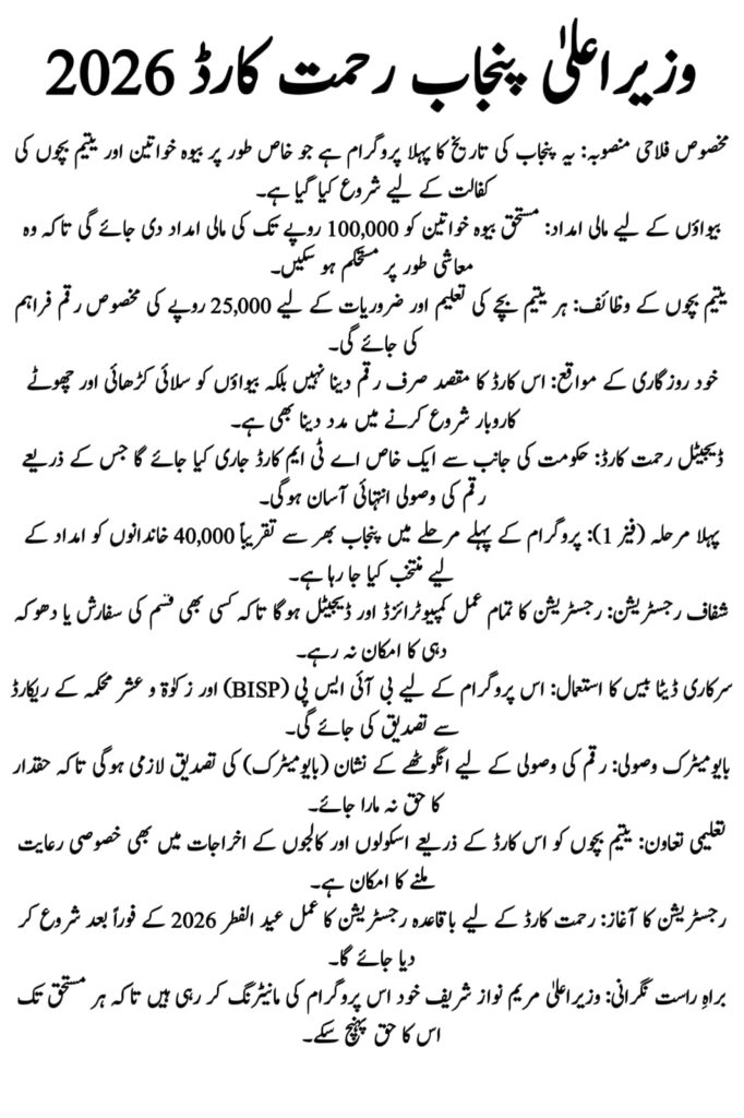 The CM Punjab Rehmat Card 2026 is a revolutionary step toward building a “Social Welfare State” in Punjab. By providing up to Rs. 100,000 to widows and specialized support for orphans, the government is tackling poverty at its roots. If you meet the criteria, make sure your NADRA records are updated so you can apply as soon as the portal opens after Eid.