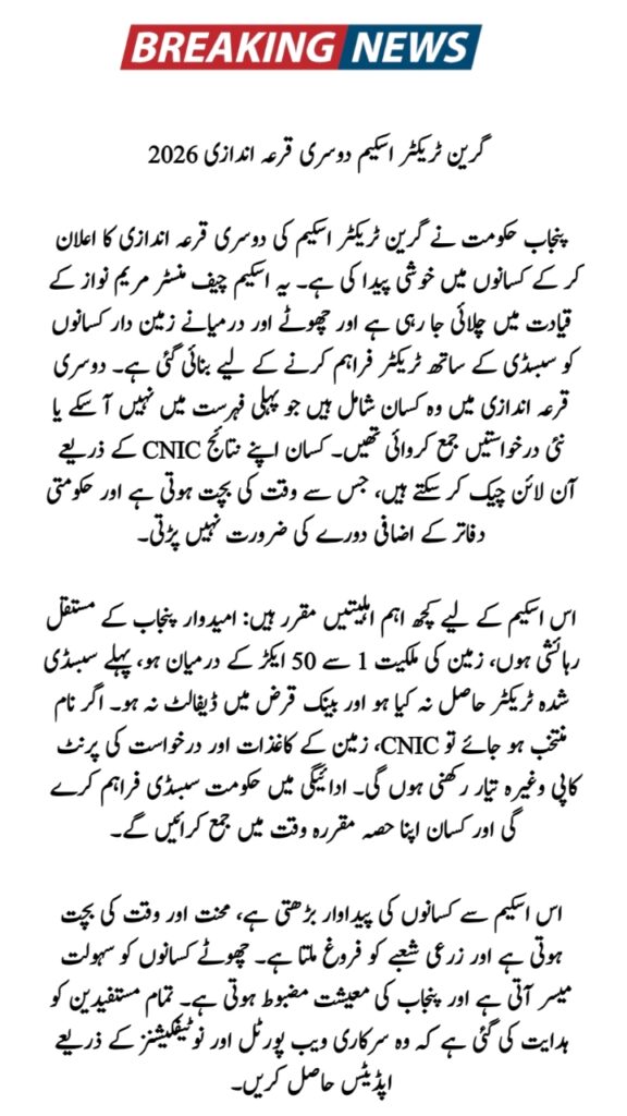 The Punjab government has announced the Green Tractor Scheme 2nd balloting result, bringing relief and excitement for farmers. Under Chief Minister Maryam Nawaz’s leadership, this scheme provides subsidized tractors to deserving farmers. The second balloting ensures fair selection for those who were on the waiting list or newly applied. Farmers can check their results online instantly using their CNIC number. This initiative aims to improve farming productivity, reduce manual labor, and support the agricultural sector. Both small and medium landowners in Punjab benefit from this program. The announcement is verified through official sources and top-ranking Google updates.