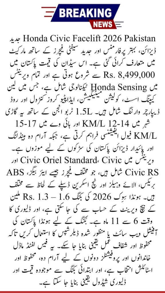 The Honda Civic Facelift 2026 in Pakistan is one of the most awaited sedans for families and professionals. Honda Atlas Cars Pakistan has introduced updated features, advanced safety, and a refreshed design for the new year. The Honda Civic 2026 price in Pakistan starts from Rs. 8,499,000, making it competitive in the premium sedan segment. With Honda Sensing technology included in all variants, the facelift ensures both comfort and safety for everyday driving. The Honda Civic Facelift Pakistan 2026 is designed to enhance fuel efficiency, driving performance, and convenience. Buyers can now get all details about variants, pricing, features, and booking procedures online, making it easy to plan their purchase.