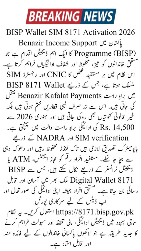 The BISP Wallet SIM 8171 Activation 2026 system ensures secure, fast, and transparent payments under the Benazir Income Support Programme. Linking CNIC, SIM, and biometric verification guarantees that payments reach the correct beneficiary without delays or deductions. All beneficiaries should complete SIM verification and wallet activation to receive BISP 8171 payments safely and reliably.