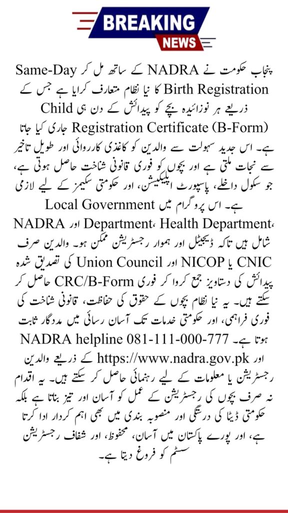 Punjab’s same-day birth registration initiative with NADRA ensures every newborn receives a Child Registration Certificate (B-Form) on the day of birth. By connecting hospitals, union councils, and NADRA digitally, parents can complete registration quickly and securely. This system safeguards children’s rights, simplifies legal documentation, and provides instant access to essential services, including school admissions, passports, and government programs.