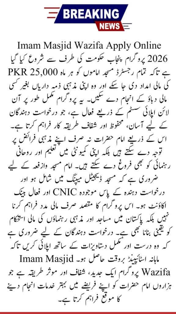 The Imam Masjid Wazifa Apply Online 2026 program is a Punjab Government welfare initiative designed to provide financial support to registered mosque imams. Eligible imams receive a monthly stipend of PKR 25,000 directly in their bank accounts. The program is fully digital, allowing imams to apply online, avoid long office queues, and receive timely payments. This initiative helps imams focus on religious duties while ensuring transparency and accountability.