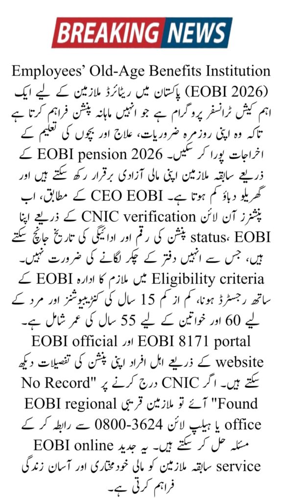 The Employees’ Old-Age Benefits Institution (EOBI 2026) provides monthly pension payments to retired employees in Pakistan. These EOBI cash transfers are a key source of financial independence for pensioners, helping cover daily expenses, healthcare, and children’s education. In 2026, pensioners can now check EOBI status online using their CNIC, making it easier to track eligibility, pension amount, and payment history without visiting an office.