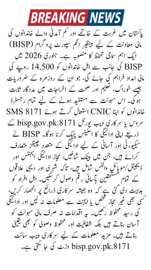 The BISP January 2026 Payment is set to begin in January and will be paid in phases throughout the month so beneficiaries can collect money safely and without large crowds. The amount for registered and eligible families has been increased to Rs. 14,500 per quarter. This information comes from the official website 8171.bisp.gov.pk and trusted Google sources that track BISP news and updates.
