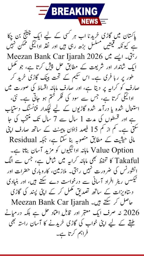 Meezan Bank Car Ijarah 2026 is a reliable and halal solution for people who want to own a car without interest. It offers flexible tenure, affordable rentals, and Shariah-compliant financing. The residual value option helps reduce monthly payments, making it easier for middle-income families. In this article, we are sharing all the details about Meezan Bank Car Ijarah 2026, including features, eligibility, documents, and step-by-step application process. If you are planning to buy a car this year, Meezan Bank Car Ijarah 2026 is one of the best Islamic options available in Pakistan.