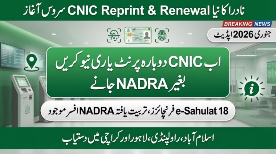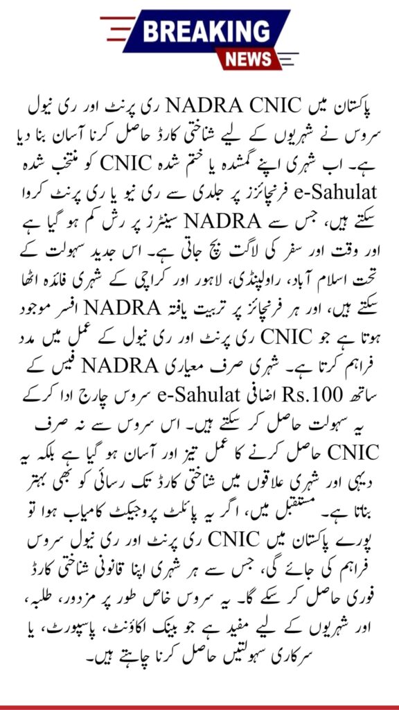 The new CNIC reprint and renewal service allows citizens to get their CNIC renewed or reprinted at local e‑Sahulat outlets instead of visiting crowded NADRA offices. Currently, the pilot project is running in Islamabad, Rawalpindi, Lahore, and Karachi. Each franchise has a trained NADRA officer to guide citizens. This service is ideal for people living far from major cities.