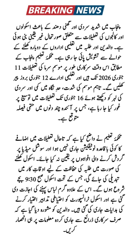Due to severe cold and dense fog across Punjab, authorities are considering extending winter holidays until January 16. Government sources say weather conditions are being reviewed daily as visibility remains poor and temperatures stay low. A formal notification is expected within the next two to three days. The possible extension aims to ensure student safety and reduce travel risks during early morning hours for schools and colleges across the province.