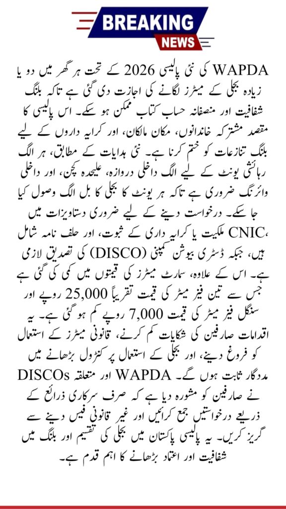 The updated WAPDA policy allowing multiple electricity meters per residence, along with reduced smart meter prices, marks a positive step toward consumer relief and billing transparency. These reforms are expected to ease disputes, improve efficiency, and strengthen trust in Pakistan’s electricity distribution system. Consumers are advised to rely only on official channels for applications and updates.